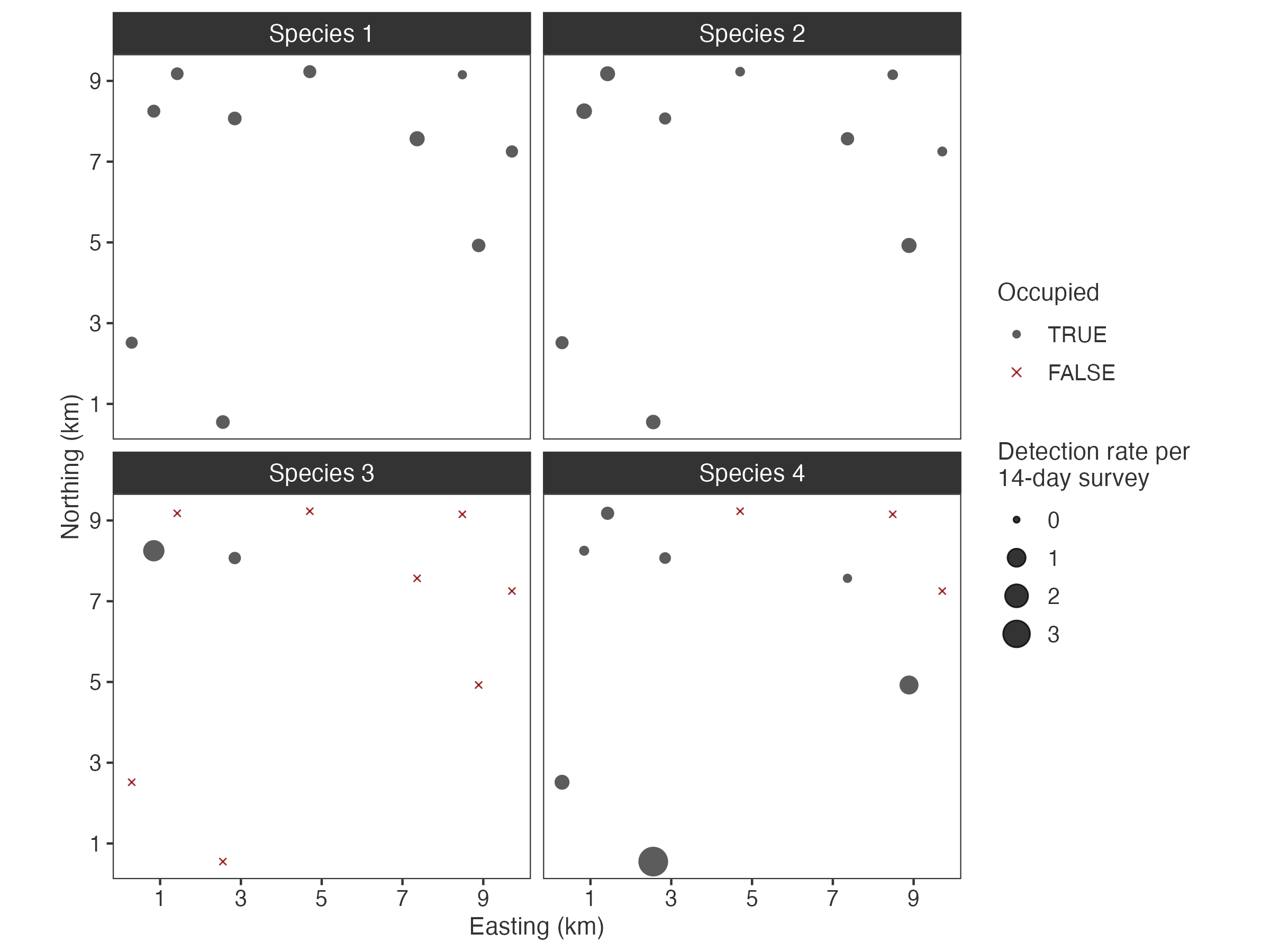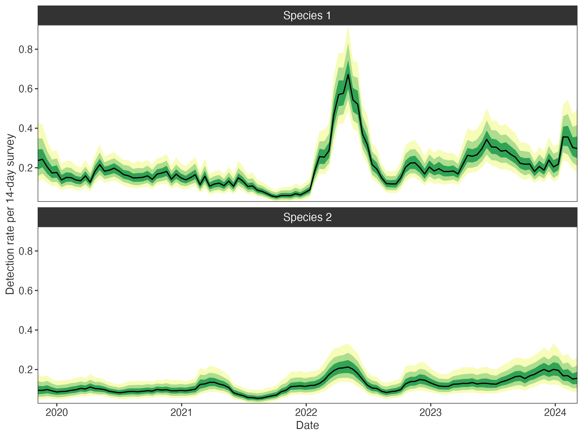plot_surveys(fit, species = c("Species 1", "Species 2"))
